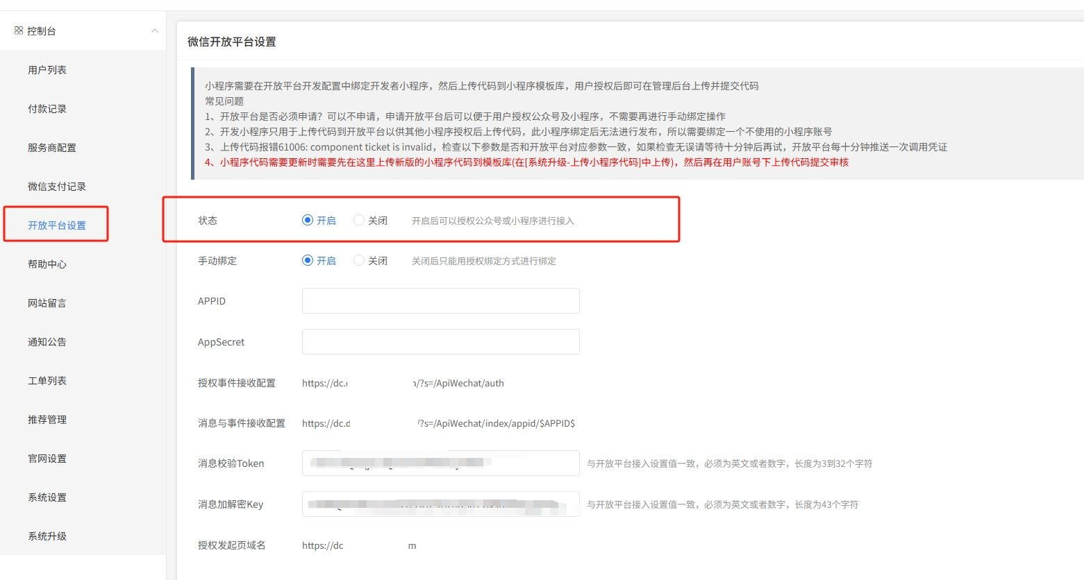 首先在控制台配置并开启开放平台配置,配置流程参考---控制台手册--【开放平台设置】章节
