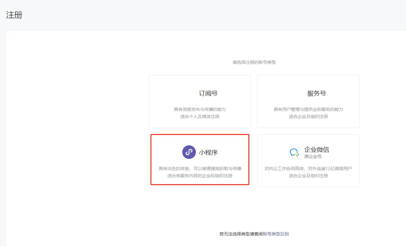账号类型选择小程序,依次按照步骤进行注册即可
