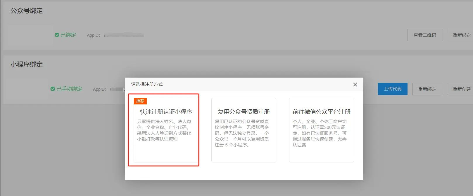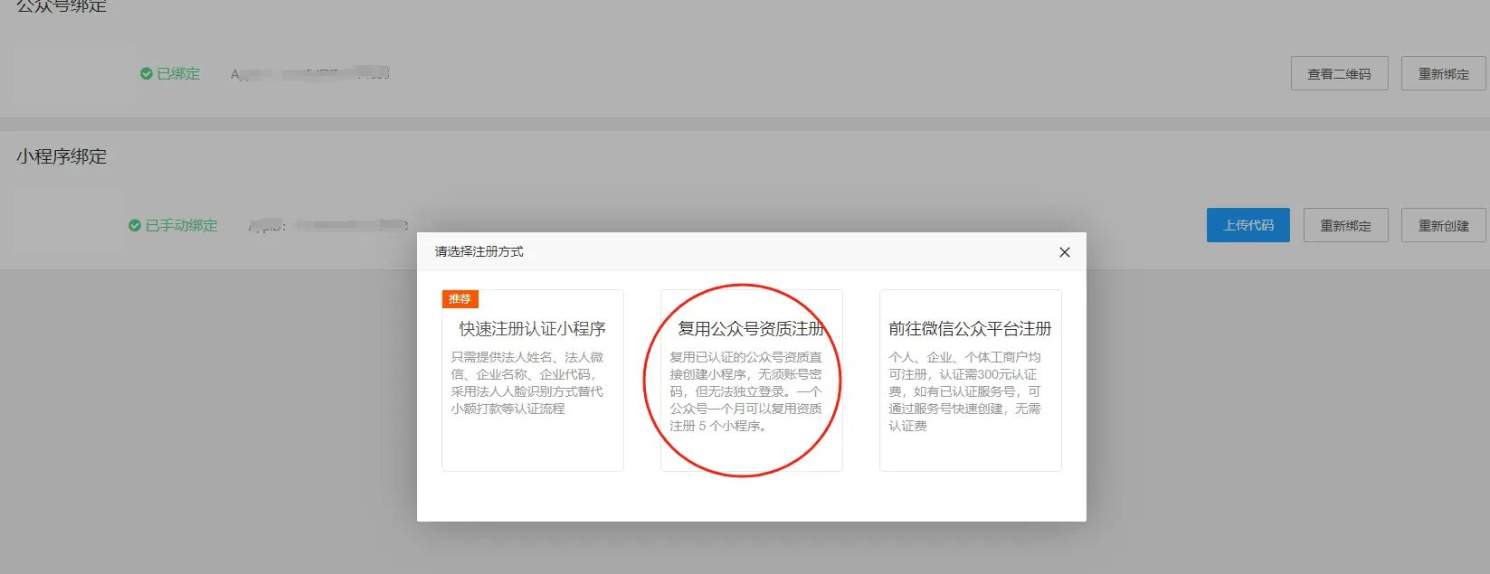 方式二:如果已注册公众号可以在后台---平台---微信小程序---小程序绑定---点击创建---选择“复用公众号资质注册”