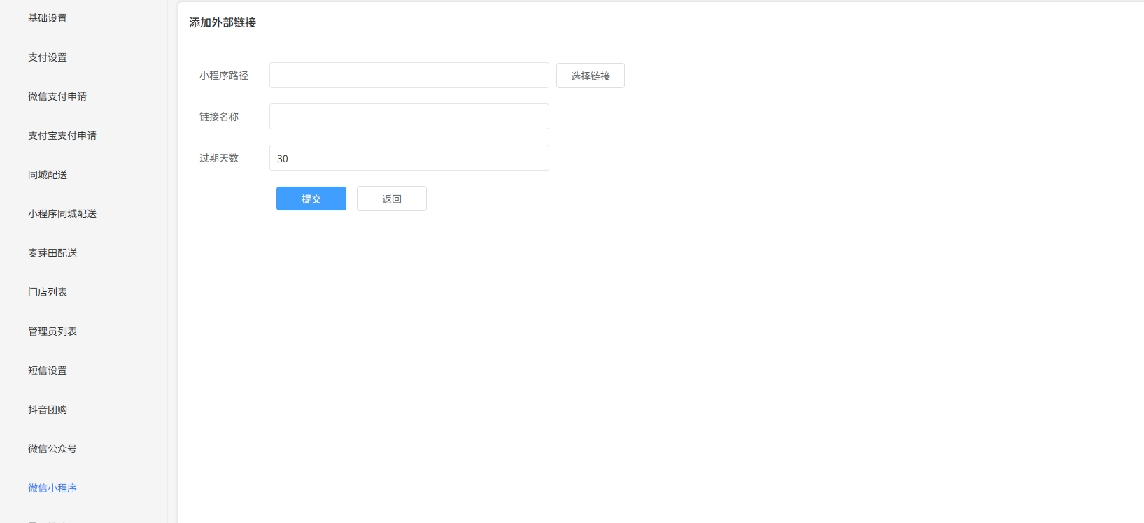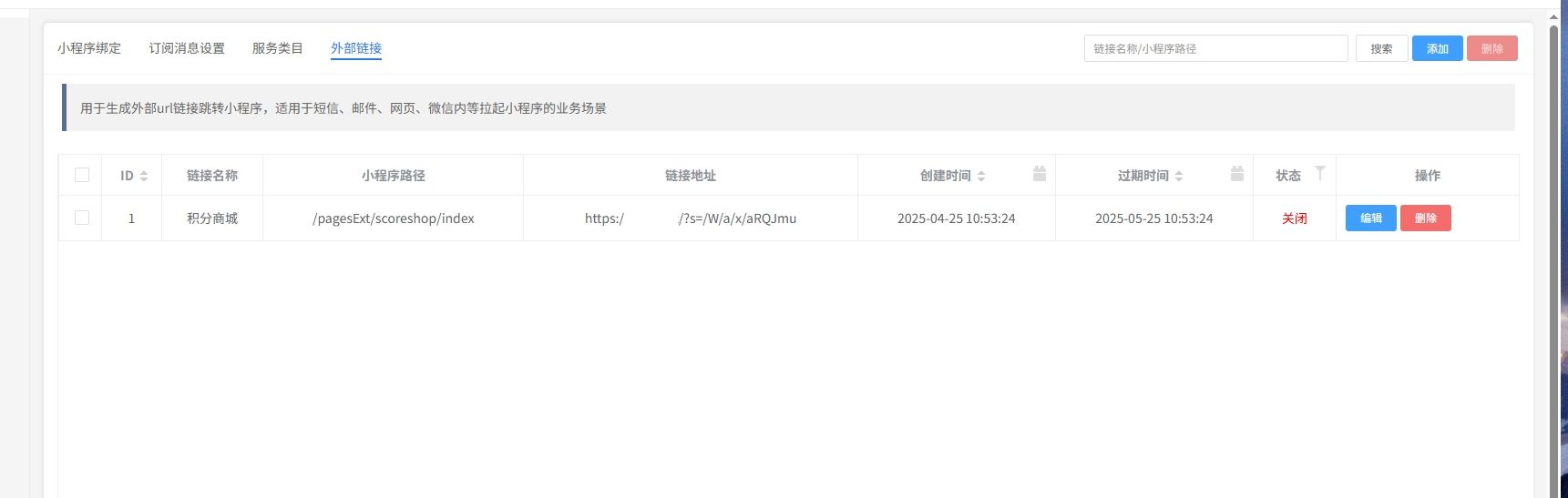 外部链接:用于生成外部url链接跳转小程序,适用于短信、邮件、网页、微信内等拉起小程序的业务场景