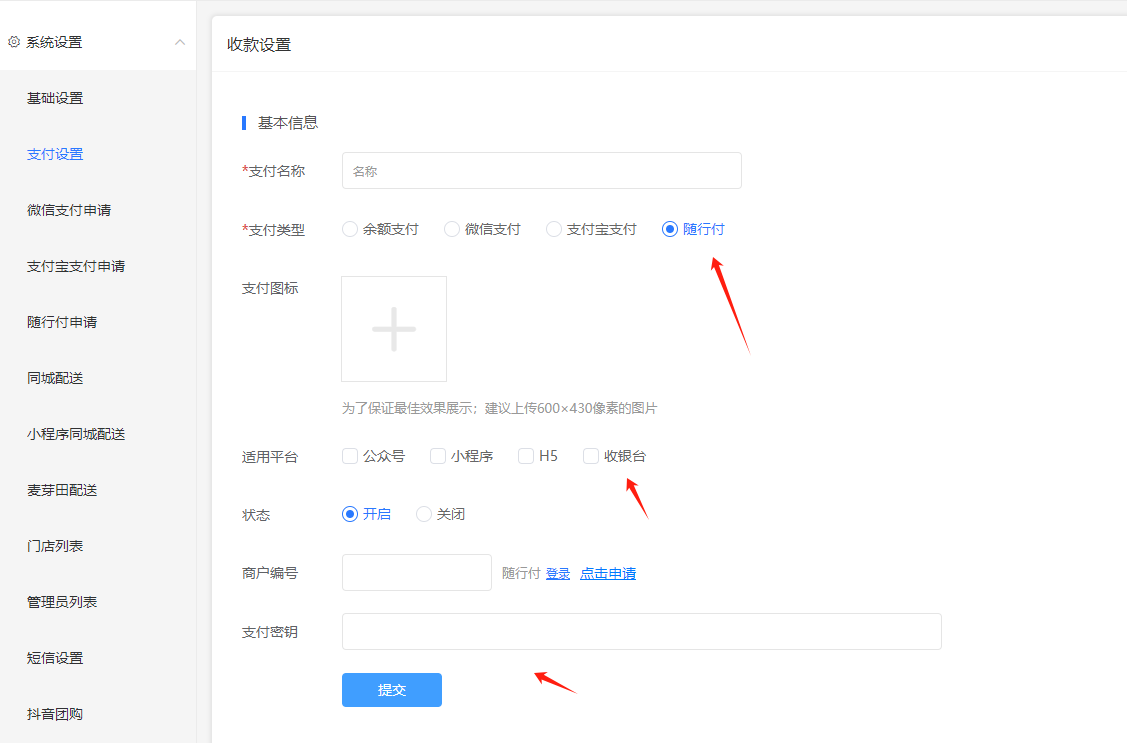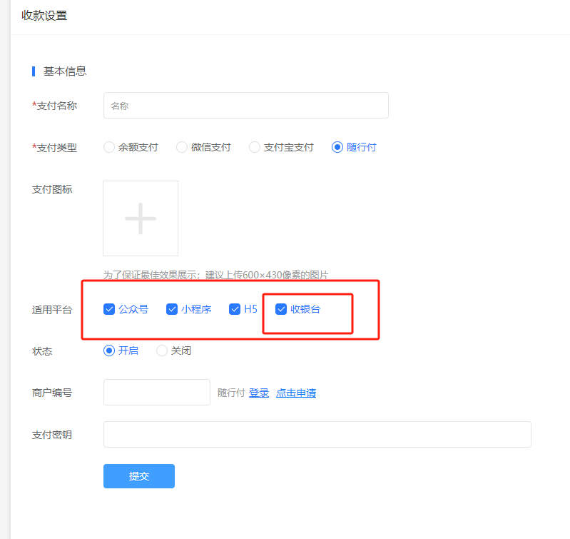 在支付设置中添加随行付。需要收银台扫用户码是,请保证开启收银台,并且只在随行付开启收银台