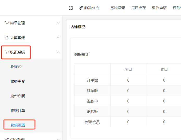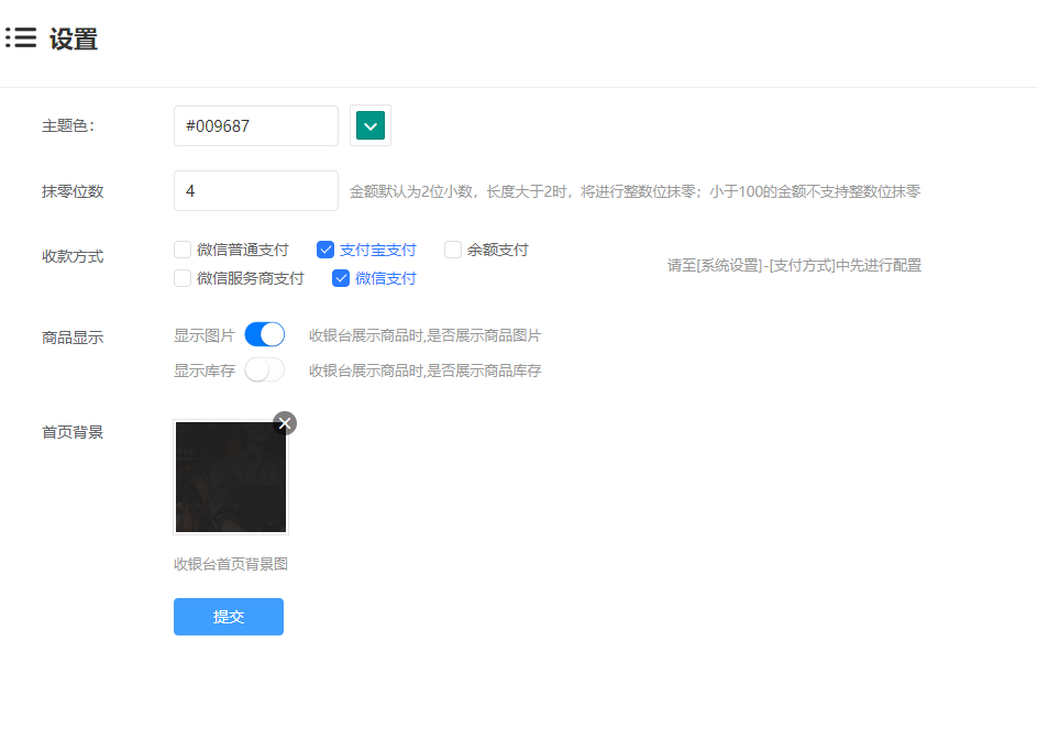 设置项目:收银台背景图,收银台主色调,收银台收款方式,金额抹零位数,收银台商品展示属性(图片,库存)