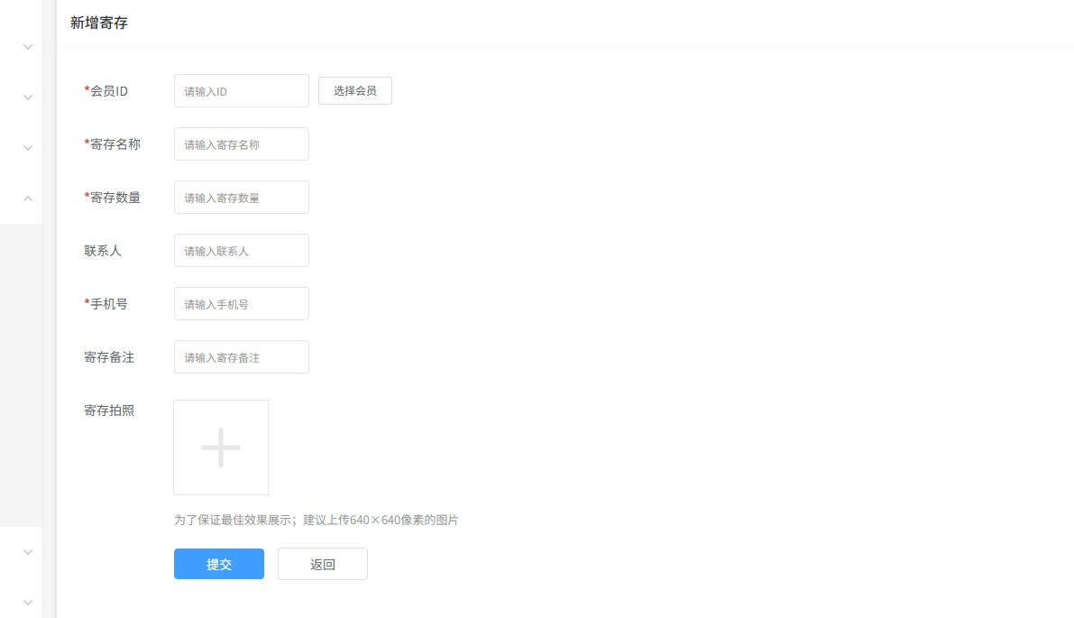 添加寄存(填写会员ID、寄存名称、寄存数量、联系人、手机号、寄存备注、寄存照片)