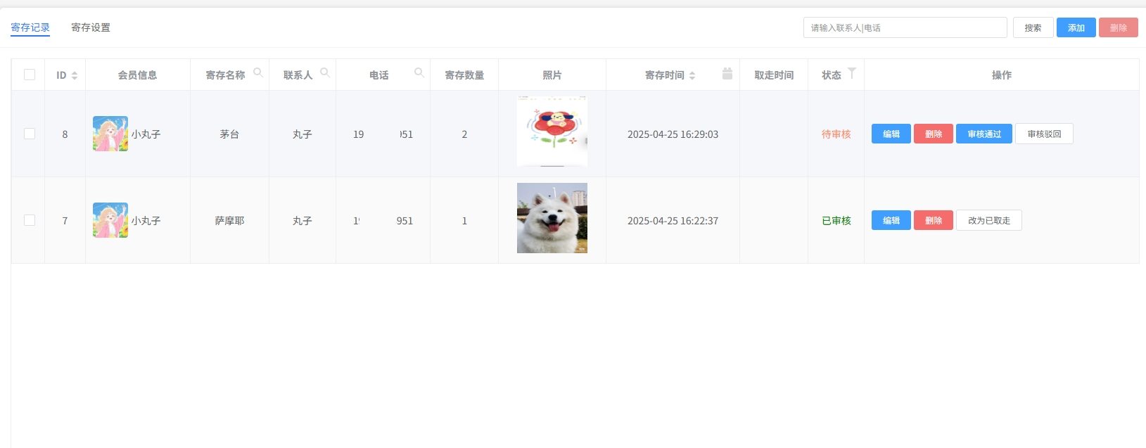 寄存记录 查询,编辑,删除客户寄存信息等。