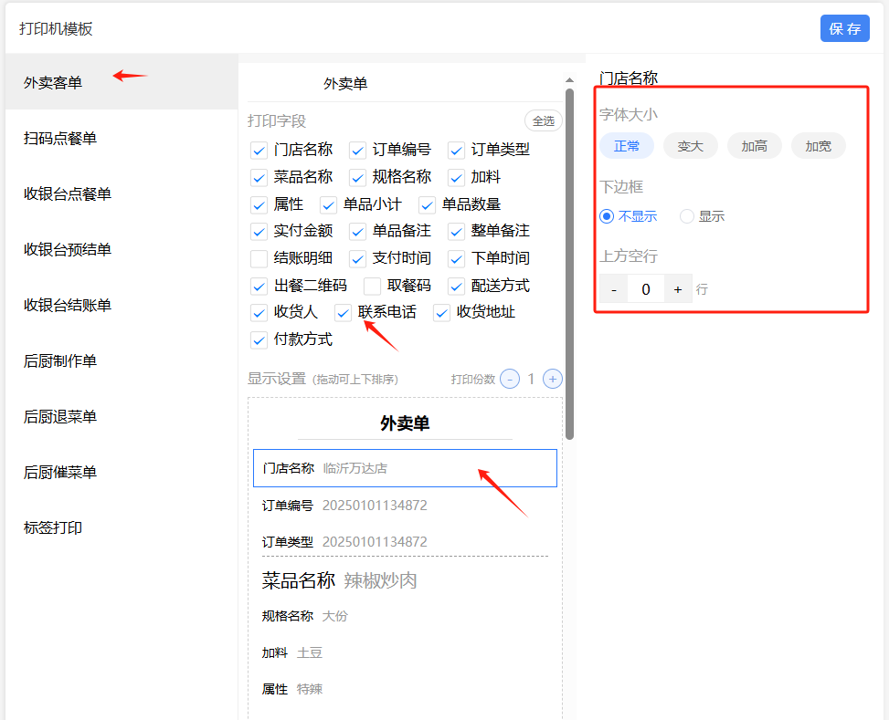 可以勾选自己想要的内容,对打印内容进行排序、字体大小的变动,下边框,上方的空行处理。