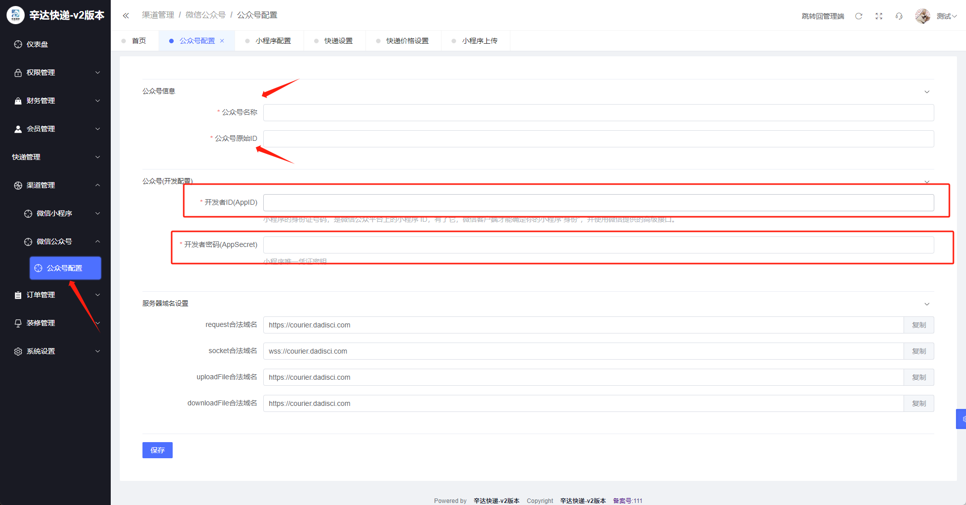 将开发者ID(AppID) 和 开发者密码(AppSecret) 复制到系统内,公众号名称和公众号原始ip按照自己的账号填写即可