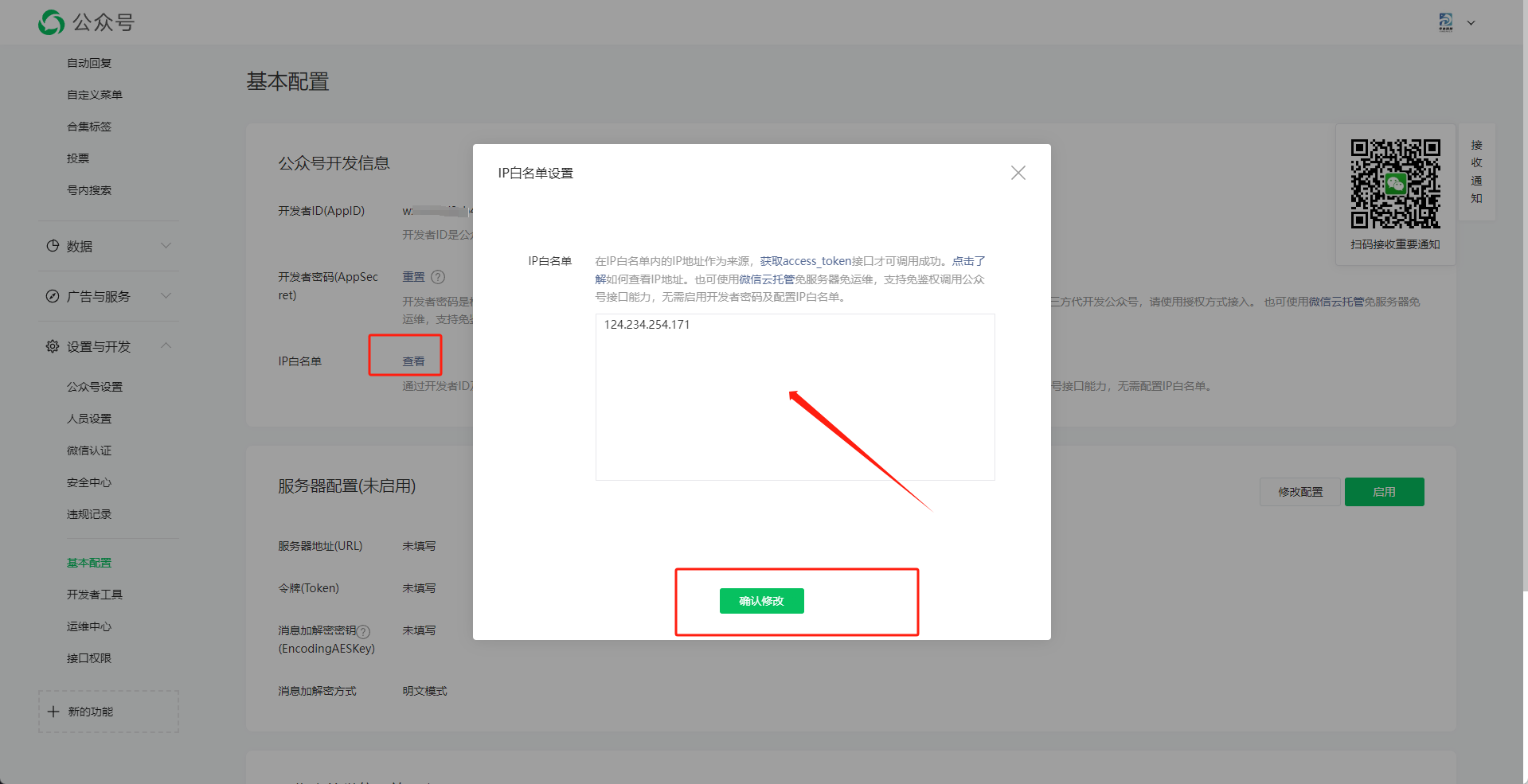 设置公众号ip白名单, 一定要把自己的服务器ip,复制进入,然后保存