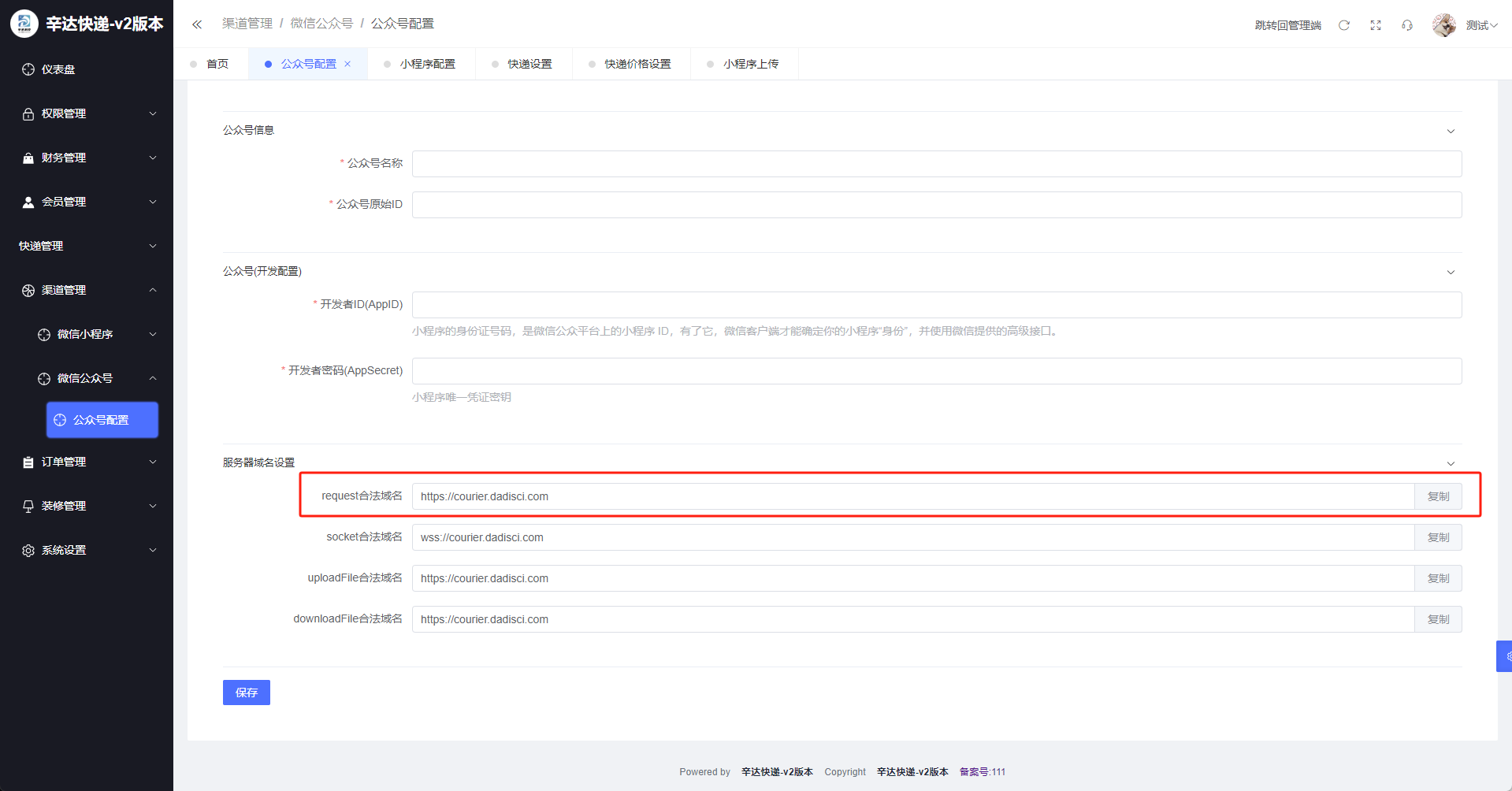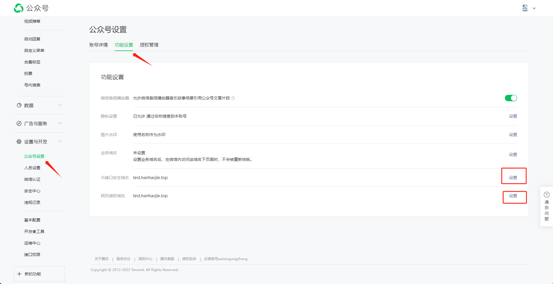 设置公众号的 JS接口安全域名 和 网页授权域名 只需要复制系统内的request合法域名,即可